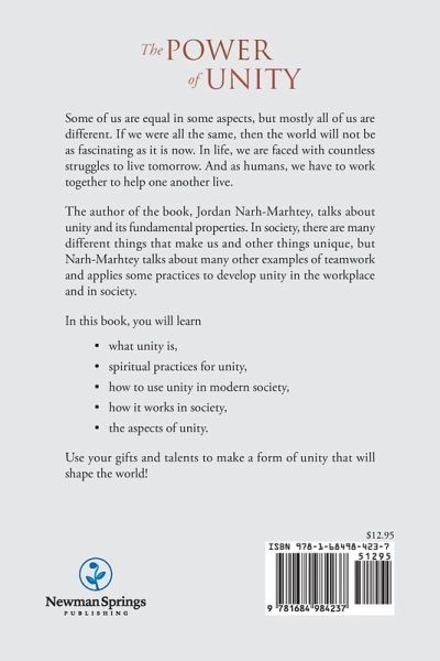 Some of us are equal in some aspects, but mostly all of us are different. If we were all the same, then the world will not be as fascinating as it is now. In life, we are faced with countless struggles to live tomorrow. And as humans, we have to work together to help one another live. The author of the book, Jordan Narh-Marhtey, talks about unity and its fundamental properties. In society, there are many different things that make us and other things unique, but Narh-Marhtey talks about many other examples of teamwork and applies some practices to develop unity in the workplace and in society. In this book, you will learn what unity is, spiritual practices for unity, how to use unity in modern society, how it works in society, the aspects of unity. Use your gifts and talents to make a form of unity that will shape the world!