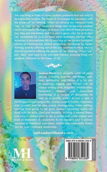 We are living in times of many societal problems that are said to be impossible to solve. The Power of Us changes this paradigm with the power of "us"-thinking. When we reframe our viewpoint from "me," to "we," to "us," miraculous things start to become possible much more easily. The Power of Us is an overview of these problems, how they are interlinked, and it is also a game plan for us to start "us" movements for each of these social problems, starting within ourselves. It accomplishes this by touching on the current biological science of consciousness, clinical psychology techniques for better thinking, and by offering out-of-the-box solutions to these various societal problems utilizing the power of "us"-thinking. When "we" join "them" and work in our own best interest, amazing things are possible. Welcome to The Power of Us!