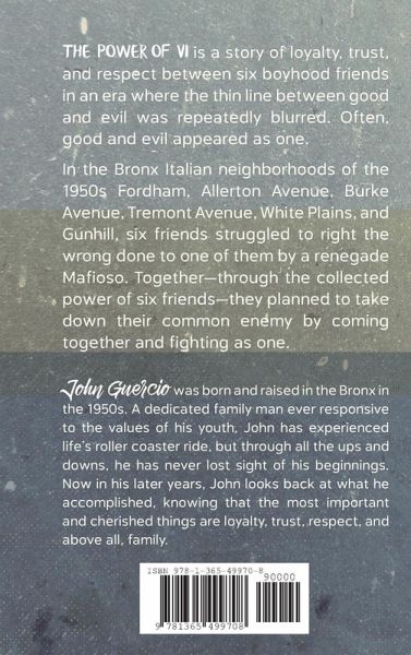 The Power of VI is a story of loyalty, trust, and respect between six boyhood friends in an era where the thin line between good and evil was repeatedly blurred. Often, good and evil appeared as one. In the Bronx Italian neighborhoods of the 1950s Fordham, Allerton Avenue, Burke Avenue, Tremont Avenue, White Plains, and Gunhill, six friends struggled to right the wrong done to one of them by a renegade Mafioso. Together- through the collected power of six friends- they planned to take down their common enemy by coming together and fighting as one.