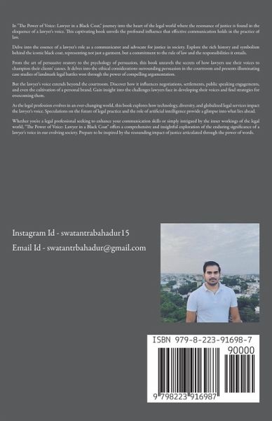 In "The Power of Voice: Lawyer in a Black Coat," journey into the heart of the legal world where the resonance of justice is found in the eloquence of a lawyer's voice. This captivating book unveils the profound influence that effective communication holds in the practice of law. Delve into the essence of a lawyer's role as a communicator and advocate for justice in society. Explore the rich history and symbolism behind the iconic black coat, representing not just a garment, but a commitment to the rule of law and the responsibilities it entails. From the art of persuasive oratory to the psychology of persuasion, this book unravels the secrets of how lawyers use their voices to champion their clients' causes. It delves into the ethical considerations surrounding persuasion in the courtroom and presents illuminating case studies of landmark legal battles won through the power of compelling argumentation. But the lawyer's voice extends beyond the courtroom. Discover how it influences negotiations, settlements, public speaking engagements, and even the cultivation of a personal brand. Gain insight into the challenges lawyers face in developing their voices and find strategies for overcoming them. As the legal profession evolves in an ever-changing world, this book explores how technology, diversity, and globalized legal services impact the lawyer's voice. Speculations on the future of legal practice and the role of artificial intelligence provide a glimpse into what lies ahead. Whether you're a legal professional seeking to enhance your communication skills or simply intrigued by the inner workings of the legal world, "The Power of Voice: Lawyer in a Black Coat" offers a comprehensive and insightful exploration of the enduring significance of a lawyer's voice in our evolving society. Prepare to be inspired by the resounding impact of justice articulated through the power of words.