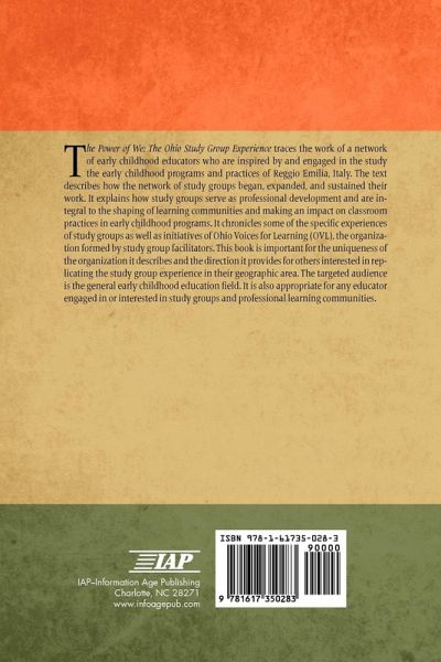 The Power of We: The Ohio Study Group Experience traces the work of a network of early childhood educators who are inspired by and engaged in the study of the early childhood programs and practices of Reggio Emilia, Italy. The text describes how the network of study groups began, expanded, and sustained their work. It explains how study groups serve as professional development and are integral to the shaping of learning communities and making an impact on classroom practices in early childhood programs. It chronicles some of the specific experiences of study groups as well as initiatives of Ohio Voices for Learning (OVL), the organization formed by study group facilitators. This book is important for the uniqueness of the organization it describes and the direction it provides for others interested in replicating the study group experience in their geographic area. The targeted audience is the general early childhood education field. It is also appropriate for any educator engaged in or interested in study groups and professional learning communities.
