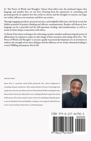 In "The Power of Words and Thoughts," Emem Ossei delves into the profound impact that language and mindset have on our lives. Drawing from his experiences in counseling and personal growth, he explores how the words we choose and the thoughts we nurture can shape our reality, influence our emotions, and drive our actions. Through engaging anecdotes, practical exercises, and insightful reflections, this book reveals the hidden potential of positive thinking and effective communication. Readers will discover how language can be a powerful tool for self-expression, healing, and transformation, as well as a means to foster deeper connections with others. As Emem Ossei shares techniques for cultivating a positive mindset and harnessing the power of affirmations, he empowers readers to take charge of their narratives and reshape their lives. "The Power of Words and Thoughts" is not just a guide to personal development; it's an invitation to embrace the strength of our inner dialogue and the influence of our words, ultimately leading to a more fulfilling and purpose-driven life.