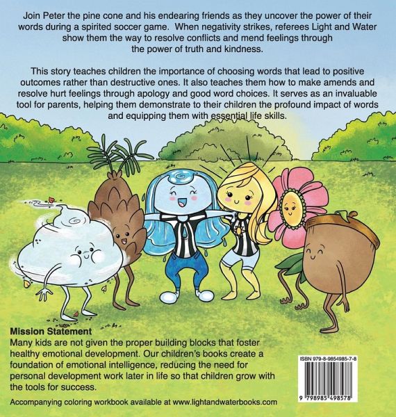 Join Peter and his friends as they navigate a heated soccer game where emotions run high. When negative comments threaten to disrupt the game, referees Light and Water step in to teach the children: how to resolve conflicts with truth, kindness, and positive communication. Through this heartwarming story, children learn that words hold incredible power, and using them wisely can lead to healing and stronger friendships. This beautifully illustrated children's book is a must-have for parents, educators, and caregivers who want to help children:Understand the importance of choosing kind and constructive words. Learn how to apologize and make amends when feeling hurt. Develop conflict resolution skills in a fun and engaging way. Perfect for social-emotional learning and character development, this story offers a powerful message about empathy, forgiveness, and friendship. Children will be captivated by the vibrant illustrations, relatable characters, and the meaningful lessons woven into the plot. Who is this book for?Parents and caregivers looking to nurture emotional intelligence and teach life skills. Teachers and educators seeking to introduce themes of kindness, communication, and conflict resolution in the classroom. Therapists and counselors working with children on emotional regulation and positive behavior. A thoughtful gift for baby showers, birthdays, and holidays, offering new parents a tool to help their children grow with emotional resilience and strong social skills.