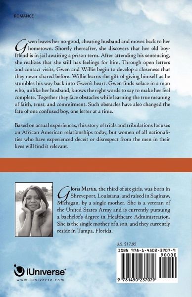 Gwen leaves her no-good, cheating husband and moves back to her hometown. Shortly thereafter, she discovers that her old boyfriend is in jail awaiting a prison term. After attending his sentencing, she realizes that she still has feelings for him. Through open letters and contact visits, Gwen and Willie begin to develop a closeness that they never shared before. Willie learns the gift of giving himself as he stumbles his way back into Gwen's heart. Gwen finds solace in a man who, unlike her husband, knows the right words to say to make her feel complete. Together they face obstacles while learning the true meaning of faith, trust, and commitment. Such obstacles have also changed the fate of one confused boy, one letter at a time. Based on actual experiences, this story of trials and tribulations focuses on African American relationships today, but women of all nationalities who have experienced deceit or disrespect from the men in their lives will find it relevant.