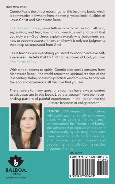 Connie Fox is the direct messenger of this inspiring book, which is communicated wholly from the non-physical individualities of Jesus Christ and Mahavatar Babaji. In The Power of You, Jesus tells us how to be free from all pain, separation, and fear; how to find your true self and be all that you truly are-God. Jesus explains exactly what judgments are, how to become aware of them, and how it is only our judgments that keep us separated from God. Jesus teaches you everything you need to know to achieve self-awareness. He tells that by finding the power of God, you find The Power of You. With direct access to spirit, Connie also seeks answers from Mahavatar Babaji, the world-renowned spiritual teacher of the last century. Babaji shares his practical wisdom-how to conquer the ego and experience all the love that you are. The answers to many questions you may have always wanted to ask Jesus are in this book. Liberate yourself from the never-ending pattern of painful experiences in life, to achieve the ultimate freedom of enlightenment.
