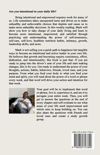 Are you intentional in your daily life? Being intentional and empowered requires more work for many of us. Life sometimes takes unexpected turns and drives us to make unhealthy and unfavorable choices that deplete and cause us to make more unhealthy decisions. In this weekly reading, Mark will show you how to take charge of your daily living and learn to become more intentional, empowered, and satisfied through practicing and understanding the power of self-awareness, self-care, self-love, healthier nutrition habits, intimacy, growth, leadership skills, and more. Mark is not selling you a quick path to happiness but tangible ways to become an intentional and active leader in your own life. Mark believes that growth and becoming require consistency, effort, dedication, and intentionality; this book is just that. If you are ready to jump into the driver's seat of your life and start making changes, this is for you. Get ready to understand the power of your thoughts, actions, habits, behaviors, friends, loved ones, and your purpose. From what you feed your body to what you feed your mind and spirit, you will read about the power of a word every week, and that word will drive your action and intention for that week. Your goal will be to implement that word, live it, experience it, and use it to navigate your entire week. Then, you will get to answer the questions at the end of every chapter and self-evaluate to see what areas of your life need improvement and which ones to keep building on. You can also share the questions with friends and loved ones and create a study growth group.