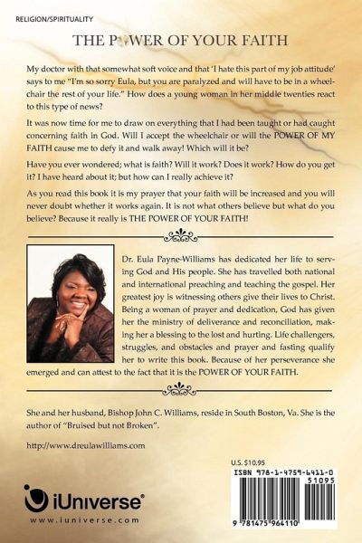 My doctor with that somewhat soft voice and that 'I hate this part of my job attitude' says to me "I'm so sorry Eula, but you are paralyzed and will have to be in a wheelchair the rest of your life." How does a young woman in her middle twenties react to this type of news? It was now time for me to draw on everything that I had been taught or had caught concerning faith in God. Will I accept the wheelchair or will the POWER OF MY FAITH cause me to defy it and walk away! Which will it be? Have you ever wondered; what is faith? Will it work? Does it work? How do you get it? I have heard about it; but how can I really achieve it? As you read this book it is my prayer that your faith will be increased and you will never doubt whether it works again. It is not what others believe but what do you believe? Because it really is THE POWER OF YOUR FAITH!