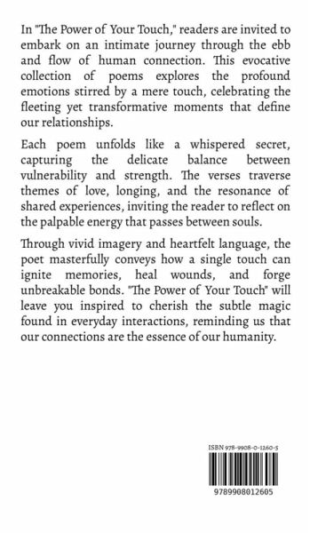 In "The Power of Your Touch," readers are invited to embark on an intimate journey through the ebb and flow of human connection. This evocative collection of poems explores the profound emotions stirred by a mere touch, celebrating the fleeting yet transformative moments that define our relationships. Each poem unfolds like a whispered secret, capturing the delicate balance between vulnerability and strength. The verses traverse themes of love, longing, and the resonance of shared experiences, inviting the reader to reflect on the palpable energy that passes between souls. Through vivid imagery and heartfelt language, the poet masterfully conveys how a single touch can ignite memories, heal wounds, and forge unbreakable bonds. "The Power of Your Touch" will leave you inspired to cherish the subtle magic found in everyday interactions, reminding us that our connections are the essence of our humanity.