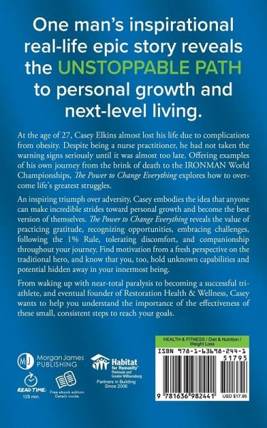 One man's real-life epic reveals the unstoppable path to personal growth and next-level living.At the age of 27, Casey Elkins almost lost his life due to complications from obesity. Despite being a nurse practitioner, he had not taken the warning signs seriously until it was too late. In The Power to Change Everything, Casey offers personal stories exploring how to overcome life's greatest struggles. He presents his own inspiring journey of adversity and triumph, from waking up in the hospital with near-total paralysis to becoming a successful triathlete and eventual founder of Restoration Health & Wellness, to demonstrate that anyone can make incredible strides toward personal growth and become the best version of themselves. The Power to Change Everything dives into topics such as practicing gratitude, recognizing opportunities, embracing challenges, following the 1% Rule, and tolerating discomfort, to help those seeking growth understand the importance of companionship on their journeys and the power of small, consistent steps to reach their goals.Find motivation from a fresh perspective on the traditional hero's motif that each of us holds capabilities and potential we may not be fully aware of, hidden away in our innermost being.