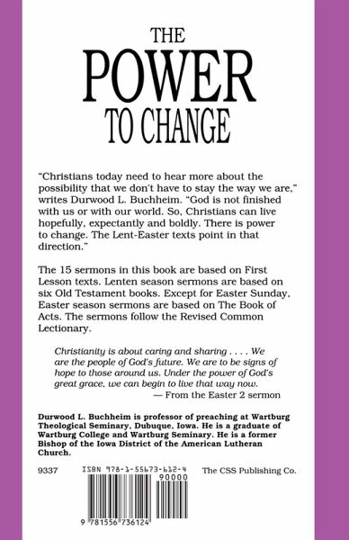 Christians today need to hear more about the possibility that we don't have to stay the way we are, writes Durwood L. Buchheim. "God is not finished with us or with our world. So, Christians can live hopefully, expectantly and boldly. There is power to change. The Lent-Easter texts point in that direction." The fifteen sermons in this book are based on First Lesson texts. Lenten season sermons are based on six Old Testament books. Except for Easter Sunday, Easter season sermons are based on the book of Acts. The sermons follow the Revised Common Lectionary. Christianity is about caring and sharing... We are the people of God's future. We are to be signs of hope to those around us. Under the power of God's great grace, we can begin to live that way now. -- from the Easter 2 sermon Durwood L. Buchheim is professor of preaching at Wartburg Theological Seminary, Dubuque, Iowa. He is a graduate of Wartburg College and Wartburg Seminary. He is a former Bishop of the Iowa District of the American Lutheran Church.