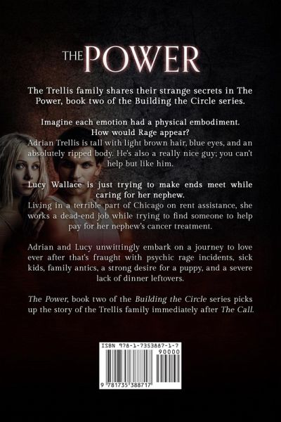 Lucy Wallace is just trying to make ends meet. She's living in a terrible part of Chicago and working a dead-end job while trying to find someone--anyone!--to help pay for her nephew's cancer treatment. She doesn't expect to find Adrian Trellis. Adrian Trellis is the second son of the wealthy Trellis family and runs the family's charity. He's a really nice guy. He's a doctor. He's extremely hot. And he's the physical embodiment of rage itself. It comes with a power Adrian has learned to control through many years of hard work and harder workouts. But Lucy has awakened a new energy in Adrian. It's more powerful... and much harder to control. If Adrian and Lucy are going to have a future together, the whole Trellis clan will need to share their secrets. The Power is the second book in the bestselling Building the Circle series. If you're new to the series, start with The Call. If not, read on for a love story fraught with psychic rage incidents, sick kids, family antics, a strong desire for a puppy, and a severe lack of dinner leftovers. The Power is not your average paranormal romance. And Adrian is not your average billionaire. If you like your heroines smart and snarky, your heroes kind and compassionate, and your romance novels snort-your-wine funny, then The Power is for you. And if you want a series that will keep you turning pages until the wee hours, then you can't miss Building the Circle.