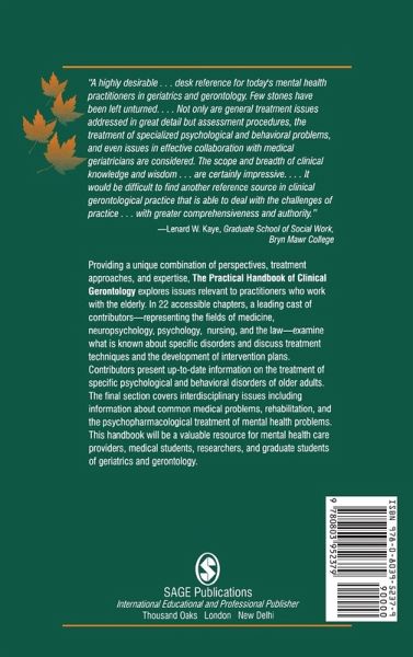 Providing a unique combination of perspectives, treatment approaches and expertise, The Practical Handbook of Clinical Gerontology explores issues relevant to practitioners who work with the elderly. In 22 accessible chapters, renowned contributors - representing fields such as psychology, medicine, neuropsychology, nursing and law - examine what is known about specific disorders and discuss treatment techniques and the development of intervention plans.