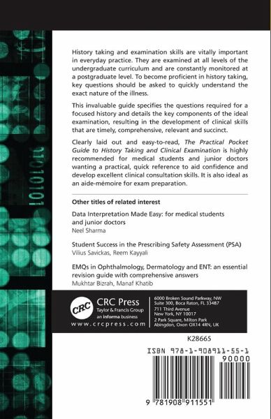 History taking and examination skills are vitally important in everyday practice. They are examined at all levels of the undergraduate curriculum and are constantly monitored at a postgraduate level. To become proficient in history taking, key questions should be asked to quickly understand the exact nature of the illness. This invaluable guide specifies the questions required for a focused history and details the key components of the ideal examination, resulting in the development of clinical skills that are timely, comprehensive, relevant and succinct. Clearly laid out and easy-to-read, The Practical Pocket Guide to History Taking and Clinical Examination is highly recommended for medical students and junior doctors wanting a practical, quick reference to aid confidence and develop excellent clinical consultation skills. It is also ideal as an aide-mémoire for exam preparation.