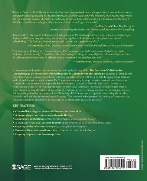 The Practice of Collaborative Counseling and Psychotherapy: Developing Skills in Culturally Mindful Helping is a comprehensive introduction to counseling and psychotherapy skills designed to teach future practitioners how to develop and foster collaborative relationships with their clients. Keeping power relations and cultural diversity at the forefront, Paré's text examines, step by step, the skills involved in collaborative therapeutic conversation-an approach that encourages a contextual view of clients and counteracts longstanding traditions of focusing primarily on individual pathology. Indeed, this insightful text teaches students how to keep clients at the heart of their therapy treatment by actively engaging them in the helping process.