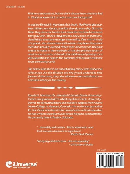 History surrounds us, but we don't always know where to find it. Would we even think to look in our own backyards? In author Ronald S. Martinez Sr.'s book, The Prairie Monster, two children are playing, just like they do every day. But this time, they discover tracks that resemble the lizard creatures they play with. In their imaginations, they make connections, visualizing a creature stranger than reality. But with the help of a priest, who shares their enthusiasm, they learn the prairie monster actually existed! When their discovery of dinosaur tracks is made in the riverbeds of the dry prairies south of what is now La Junta, Colorado, the children and priest go on a wild expedition to expose the existence of the prairie monster to an unknowing world. The Prairie Monster is an entertaining story with historical references. As the children and the priest undertake this journey of discovery, they also witness-and contribute to-Colorado history in the making.