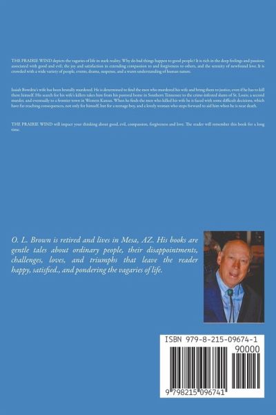 THE PRAIRIE WIND the vagaries of life in stark reality. Why do bad things happen to good people? It is rich in the deep feelings and passions associated with good and evil; the joy and satisfaction in extending compassion to and forgiveness to others, and the serenity of newfound love. It is crowded with a wide variety of people, events, drama, suspense, and a warm understanding of human nature. Isaiah Bowdrie's wife has been brutally murdered. He is determined to find the men who murdered his wife and bring them to justice, even if he has to kill them himself. His search for his wife's killers takes him from his pastoral home in Southern Tennessee to the crime-infested slums of St. Louis; a second murder, and eventually to a frontier town in Western Kansas. When he finds the men who killed his wife he is faced with some difficult decisions, which have far-reaching consequences, not only for himself, but for a teenage boy, and a lovely woman who steps forward to aid him when he is near death. THE PRAIRE WIND will impact your thinking about good, evil, compassion, forgiveness and love. The reader will remember this book for a long time.
