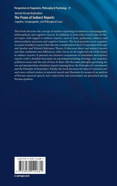 This book discusses the concept of indirect reporting in relation to sociopragmatic, philosophical, and cognitive factors. In addition, it deals with several state-of-the-art topics with regard to indirect reports, such as trust, politeness, refinery and photosynthetic processes and cognitive features. The book presents socio-cognitive accounts of indirect reports that take into consideration Grice's Cooperation Principle and Sperber and Wilson's Relevance Theory. It discusses direct and indirect reports and their similarities and differences, with a focus on the neglected role of the hearer in indirect reports. It presents an extensive comparison of translation and indirect reports (with a detailed discussion on reporting/translating slurring), and examines politeness issues and the role of trust. It deals with the main principles governing the use and interpretation of indirect reports (among them, the Principle of Commitment and the Principle of Immunity). Finally, the book discusses the idea of 'common core' and cross-cultural studies in reported speech and illustrates by means of an analysis of Persian reported speech, how subjectivity and uncertainty are presented among Persian speakers.