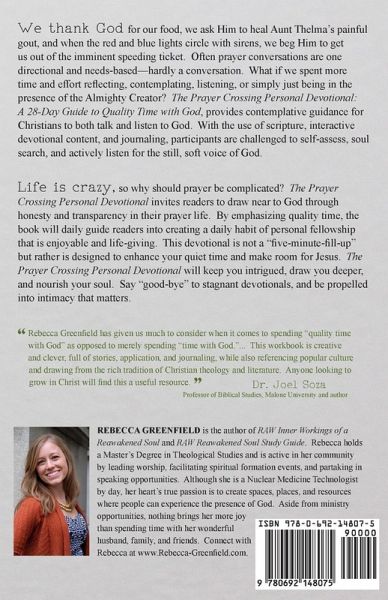 We thank God for our food, we ask Him to heal Aunt Thelma's painful gout, and when the red and blue lights circle with sirens, we beg Him to get us out of the imminent speeding ticket. Often prayer conversations are one directional and needs-based-hardly a conversation. What if we spent more time and effort reflecting, contemplating, listening, or simply just being in the presence of the Almighty Creator? The Prayer Crossing Personal Devotional: A 28-Day Guide to Quality Time with God, provides contemplative guidance for Christians to both talk and listen to God. With the use of scripture, interactive devotional content, and journaling, participants are challenged to self-assess, soul search, and actively listen for the still, soft voice of God. Life is crazy, so why should prayer be complicated? The Prayer Crossing Personal Devotional invites readers to draw near to God through honesty and transparency in their prayer life. By emphasizing quality time, the book will daily guide readers into creating a daily habit of personal fellowship that is enjoyable and life-giving. This devotional is not a "five-minute-fill-up" but rather is designed to enhance your quiet time and make room for Jesus. The Prayer Crossing Personal Devotional will keep you intrigued, draw you deeper, and nourish your soul. Say "good-bye" to stagnant devotionals and be propelled into intimacy that matters.