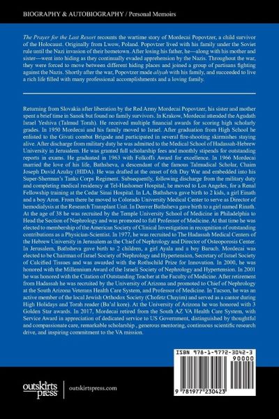 The Prayer for the Last Resort recounts the wartime story of Mordecai Popovtzer, a child survivor of the Holocaust. Originally from Lwow, Poland. Popovtzer lived with his family under the Soviet rule until the Nazi invasion of their hometown. After losing his father, he-along with his mother and sister-went into hiding as they continually evaded apprehension by the Nazis. Throughout the war, they were forced to move between different hiding places and joined a group of partisans fighting against the Nazis. Shortly after the war, Popovtzer made aliyah with his family, and succeeded to live a rich life filled with many professional accomplishments and a loving family.