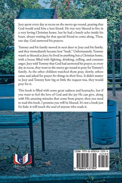 Joey spent every day at recess on the merry-go-round, praying that God would send him a best friend. He was very blessed to live in a very loving Christian home, but he had a lonely ache inside his heart, always waiting for that special friend to come along. Then, one day, God answered his prayers. Tommy and his family moved in next door to Joey and his family, and they immediately became best "buds." Unfortunately, Tommy wasn't as blessed as Joey; he lived in anything but a Christian home, with a house filled with fighting, drinking, yelling, and constant anger. Joey told Tommy that God had answered his prayer, so every day at recess, they went to the merry-go-round to pray for Tommy's family. As the other children watched them pray, slowly, others came and asked for prayer for things in their lives. It didn't matter to Joey and Tommy how big or little the request was, they would pray for it. This book is filled with some great sadness and heartache, but if you want to feel the love of God and the joy He can give, along with His amazing miracles that come from prayer, then you need to read this book. I promise you will be blessed. It's not a book just for kids; it will touch the soul of anyone who reads it.