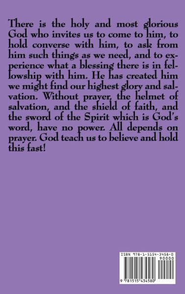 There is the holy and most glorious God who invites us to come to him, to hold converse with him, to ask from him such things as we need, and to experience what a blessing there is in fellowship with him. He has created him we might find our highest glory and salvation. Without prayer, the helmet of salvation, and the shield of faith, and the sword of the Spirit which is God's word, have no power. All depends on prayer. God teach us to believe and hold this fast!