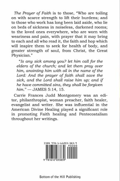 The Prayer of Faith is to those, "Who are toiling on with scarce strength to lift their burdens; and to those who work has long been laid aside, who lie on beds of sickness in noiseless, darkened rooms; to the loved ones everywhere, who are worn with weariness and pain, with prayer that it may bring to each and all who read it, the faith and hop which will inspire them to seek for health of body, and greater strength of soul, from Christ, the Great Physician." "Is any sick among you? let him call for the elders of the church; and let them pray over him, anointing him with oil in the name of the Lord: And the prayer of faith shall save the sick, and the Lord shall raise him up; and if he have committed sins, they shall be forgiven him.'' - JAMES 5:14, 15. Carrie Frances Judd Montgomery was an editor, philanthropist, woman preacher, faith healer, evangelist and writer. She was influential in the American Divine Healing played a significant role in promoting Faith healing and Pentecostalism throughout her writings.