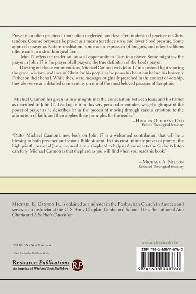 Prayer is an often practiced, more often neglected, and less often understood practice of Christendom. Counselors prescribe prayer as a means to reduce stress and lower blood pressure. Some approach prayer as Eastern meditation, some as an expression of tongues, and other traditions offer chants in a strict liturgical form. John 17 offers the reader an unusual opportunity to listen to a prayer. Some might say the prayer in John 17 is the prayer of all prayers, the true definition of the Lord's prayer. Drawing on classic commentators, Michael Cannon casts John 17 in a pastoral light showing the grace, wisdom, and love of Christ for his people as he pours his heart out before his heavenly Father on their behalf. While these were messages originally preached in the context of worship, they also serve as a detailed commentary on one of the most beloved passages of Scripture.