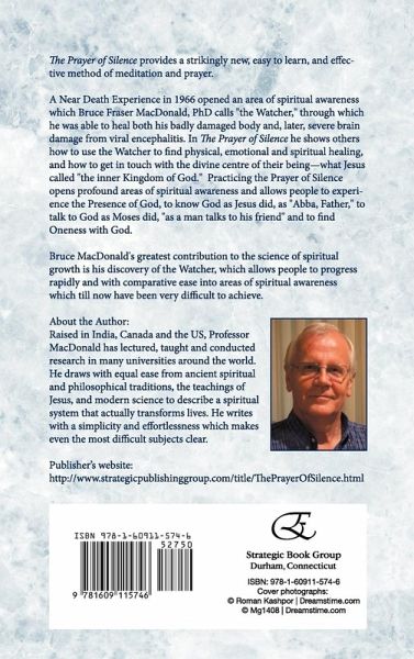 The Prayer of Silence provides a strikingly new, easy to learn, and effective method of meditation and prayer. A Near Death Experience in 1966 opened an area of spiritual awareness which Bruce Fraser MacDonald, PhD calls "the Watcher," through which he was able to heal both his badly damaged body and, later, severe brain damage from viral encephalitis. In The Prayer of Silence he shows others how to use the Watcher to find physical, emotional and spiritual healing, and how to get in touch with the divine centre of their being -- what Jesus called "the inner Kingdom of God." Practicing the Prayer of Silence opens profound areas of spiritual awareness and allows people to experience the Presence of God, to know God as Jesus did, as "Abba, Father," to talk to God as Moses did, "as a man talks to his friend" and to find Oneness with God. Bruce MacDonald's greatest contribution to the science of spiritual growth is his discovery of the Watcher, which allows people to progress rapidly and with comparative ease into areas of spiritual awareness which till now have been very difficult to achieve. About the Author: Raised in India, Canada and the US, Professor MacDonald has lectured, taught and conducted research in many universities around the world. He draws with equal ease from ancient spiritual and philosophical traditions, the teachings of Jesus, and modern science to describe a spiritual system that actually transforms lives. He writes with a simplicity and effortlessness which makes even the most difficult subjects clear. Publisher's website: http://www.strategicpublishinggroup.com/title/ThePrayerOfSilence.html