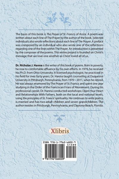 The basis of this book is The Prayer of St. Francis of Assisi. A poem was written about each line of The Prayer by the author of the book. Selected individuals also wrote reflections about each line of The Prayer. A preface was composed by an individual who also wrote one of the reflections regarding one of the lines within The Prayer. An introduction is presented by the composer of the poems. This entire project is founded on Christ's message that we love one another as Christ loved all of us.