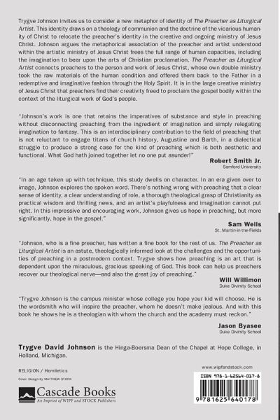Trygve Johnson invites us to consider a new metaphor of identity of The Preacher as Liturgical Artist. This identity draws on a theology of communion and the doctrine of the vicarious humanity of Christ to relocate the preacher's identity in the creative and ongoing ministry of Jesus Christ. Johnson argues the metaphorical association of the preacher and artist understood within the artistic ministry of Jesus Christ frees the full range of human capacities, including the imagination to bear upon the arts of Christian proclamation. The Preacher as Liturgical Artist connects preachers to the person and work of Jesus Christ, whose own double ministry took the raw materials of the human condition and offered them back to the Father in a redemptive and imaginative fashion through the Holy Spirit. It is in the large creative ministry of Jesus Christ that preachers find their creativity freed to proclaim the gospel bodily within the context of the liturgical work of God's people.