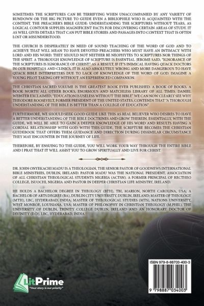 Sometimes the scriptures can be terrifying when unaccompanied by any variety of rundown or the big picture to guide even a bibliophile who is acquainted with the content. the preacher's bible guide: understanding the scriptures without tears, as logical contour supplies magnificent facts for discovering certain areas of study. It as well gives details that can put bible stories and passages into context that is often lost or misunderstood. The church is desperately in need of sound teaching of the word of God and to achieve that will mean to have devoted preachers who must have an intimacy with Lord and His word. they should not neither be neophytes to scriptures nor things of the spirit. A thorough knowledge of scripture is essential. Jerome said, "ignorance of the scriptures is ignorance of Christ" as a result, if it's inimical having quack doctors in our hospitals and clinics, it is also absolutely wrong and more dangerous to have quack bible interpreters due to lack of knowledge of the word of God. Imagine a young pilot taking off without an experienced companion. The Christian sacred volume is the greatest book ever published. A book of books. A book worth all other books, enormous and matchless library of all times. Daniel webster exclaimed, "education is useless without the bible" we can now clearly see why Theodore Roosevelt, former president of the United States, contends that "a thorough understanding of the bible is better than a college of education" Furthermore, we should seek good guide like this as real believer who desires to have a better understanding of the bible doctrines and grow therein. Essentially, with the guide, we will be able to gain a deeper knowledge of his word and results having a cordial relationship with God. With this guide, the scripture becomes the Christian guidebook that offers them guidance and direction during dissimilar circumstance they may encounter in the journey of life. Therefore, by ensuing to the guide, you will work your way through the entire bible and I pray that it will assist you to grow spiritually and live for Christ.