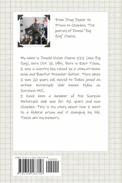 My name is Donald Vivian Owens III (aka Zig Zag), born Oct. 10, 1951. Born in East Texas, I was a country boy raised by a stay-at-home mom and Baptist Preacher father. Then when I was 20 years old, moved to Dallas joined an outlaw motorcycle club known today as Scorpions M/C. I have been a member of the Scorpion Motorcycle club now for 42 years and now Chaplain. This is my story about how I went to a federal prison and it changing my life. These are my memoirs.