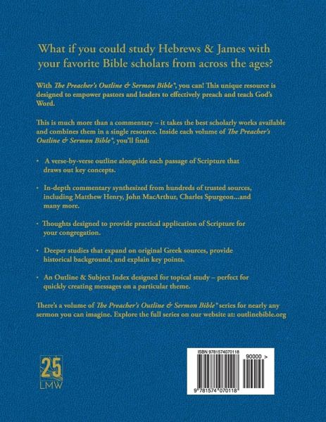 What if you could study Hebrews & James with your favorite Bible scholars from across the ages? With The Preacher's Outline & Sermon Bible, you can! This unique resource is designed to empower pastors and leaders to effectively preach and teach God's Word. This is much more than a commentary - it takes the best scholarly works available and combines them in a single resource. Inside each volume of The Preacher's Outline & Sermon Bible, you'll find: - A verse-by-verse outline alongside each passage of Scripture that draws out key concepts. - In-depth commentary synthesized from hundreds of trusted sources, including Matthew Henry, John MacArthur, Charles Spurgeon...and many more. - Thoughts designed to provide practical application of Scripture for your congregation. - Deeper studies that expand on original Greek sources, provide historical background, and explain key points. - An Outline & Subject Index designed for topical study - perfect for quickly creating messages on a particular theme. There's a volume of The Preacher's Outline & Sermon Bible series for nearly any sermon you can imagine. Explore the full series on our website at outlinebible.org