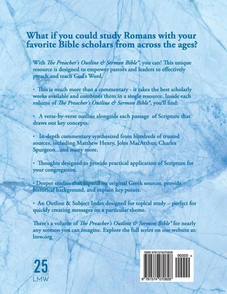 What if you could study Romans with your favorite Bible scholars from across the ages? With The Preacher's Outline & Sermon Bible, you can! This unique resource is designed to empower pastors and leaders to effectively preach and teach God's Word. This is much more than a commentary - it takes the best scholarly works available and combines them in a single resource. Inside each volume of The Preacher's Outline & Sermon Bible, you'll find: - A verse-by-verse outline alongside each passage of Scripture that draws out key concepts. - In-depth commentary synthesized from hundreds of trusted sources, including Matthew Henry, John MacArthur, Charles Spurgeon...and many more. - Thoughts designed to provide practical application of Scripture for your congregation. - Deeper studies that expand on original Greek sources, provide historical background, and explain key points. - An Outline & Subject Index designed for topical study - perfect for quickly creating messages on a particular theme. There's a volume of The Preacher's Outline & Sermon Bible series for nearly any sermon you can imagine. Explore the full series on our website at outlinebible.org