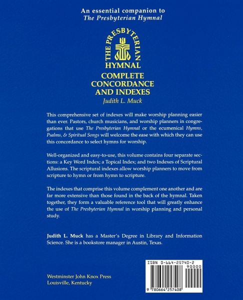 This valuable reference tool will greatly enhance use of "The Presbyterian Hymnal" in worship planning and personal study. Church musicians and pastors will welcome the ease with which they can locate keywords, topics, and scriptural allusions in every hymn. The keyword index identifies the hymn and stanza in which a word appears; the topical index indicates where topics are found; and two scriptural allusions indexes move from Scripture to hymn and from hymn to Scripture.