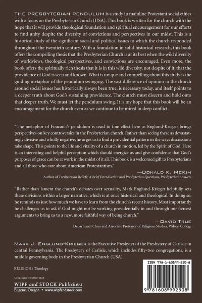 The Presbyterian Pendulum is a study in mainline Protestant social ethics with a focus on the Presbyterian Church (USA). This book is written for the church with the hope that it will provide theological foundation and spiritual encouragement for our efforts to find unity despite the diversity of convictions and perspectives in our midst. This is a historical study of the significant social and political issues to which the church responded throughout the twentieth century. With a foundation in solid historical research, this book offers the compelling thesis that the Presbyterian Church is at its best when the wild diversity of worldviews, theological perspectives, and convictions are encouraged. Even more, the book offers the spiritually rich thesis that it is in this wild diversity, not despite of it, that the providence of God is seen and known. What is unique and compelling about this study is the guiding metaphor of the pendulum swinging. The vast difference of opinion in the church around social issues has historically always been true, is necessary today, and itself points to a deeper truth about God's sustaining providence. The church must discern and hold onto that deeper truth. We must let the pendulum swing. It is my hope that this book will be an encouragement for the church even as we continue to be mired in deep conflict.