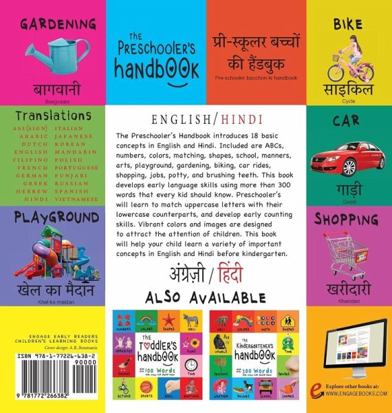 The Preschooler's Handbook introduces 18 basic concepts in English and Hindi. Included are ABCs, numbers, colors, matching, shapes, school, manners, arts, playground, gardening, biking, car rides, shopping, jobs, potty, and brushing teeth. This book develops early language skills using more than 300 words that every kid should know. Preschooler's will learn to match uppercase letters with their lowercase counterparts, and develop early counting skills. Vibrant colors and images are designed to attract the attention of children. This book will help your child learn a variety of important concepts in English and Hindi before kindergarten.