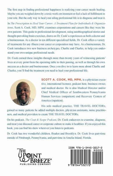 The first step in finding professional happiness is realizing your career needs healing. Maybe you are weighed down by a toxic work environment or feel a lack of fulfillment in your role. But the only way to heal your ailing professional life is to diagnose and treat it. In The Prescription to Heal Your Career: A Treatment Plan for Individuals & Organizations, Scott A. Cook, MD, MPH, examines corporations and careers like they were his own patients. This guide to professional development, using autobiographical stories and thought-provoking brain exercises, draws on Dr. Cook's experiences as both a doctor and a businessman. As a doctor in ten different specialized fields, Dr. Cook offers a variety of treatments for any illness your career or corporation may have. As a businessman, Dr. Cook introduces two new business archetypes, Charlie and Charles, to help you understand your own unique professional needs. Dr. Cook earned these insights through more than twenty years of witnessing patients' lives at every point from the operating table to their passing, as well as through his own success as a doctor and businessman. Once you dive in to learn more about Charlie and Charles, you'll find the treatment you need to heal your professional life.