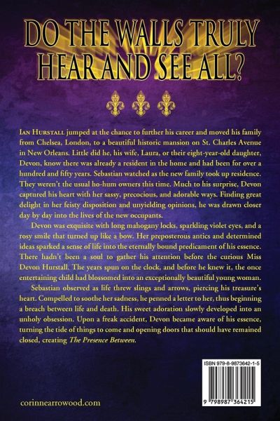 Do the walls truly hear and see all? Ian Hurstall jumped at the chance to further his career and moved his family from Chelsea, London, to a beautiful historic mansion on St. Charles Avenue in New Orleans. Little did he, his wife, Laura, or their eight-year-old daughter, Devon, know there was already a resident in the home and had been for over a hundred and fifty years. Sebastian watched as the new family took up residence. They weren't the usual ho-hum owners this time. Much to his surprise, Devon captured his heart with her sassy, precocious, and adorable ways. Finding great delight in her feisty disposition and unyielding opinions, he was drawn closer day by day into the lives of the new occupants. Devon was exquisite with long mahogany locks, sparkling violet, and a rosy smile that turned up like a bow. Her preposterous antics and determined ideas sparked a sense of life into the eternally bound predicament of his essence. There hadn't been a soul to gather his attention before the curious Miss Devon Hurstall. The years spun on the clock, and before he knew it, the once entertaining child had blossomed into an exceptionally beautiful young woman. Sebastian observed as life threw slings and arrows, piercing his treasure's heart. Compelled to soothe her sadness, he penned a letter to her, thus beginning a breach between life and death. His sweet adoration slowly developed into an unholy obsession. Upon a freak accident, Devon became aware of his essence, turning the tide of things to come and opening doors that should have remained closed, creating The Presence Between.