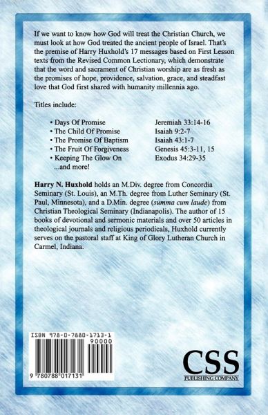 If we want to know how God will treat the Christian Church, we must look at how God treated the ancient people of Israel. That's the premise of Harry Huxhold's seventeen messages based on First Lesson texts from the Revised Common Lectionary, which demonstrate that the word and sacrament of Christian worship are as fresh as the promises of hope, providence, salvation, grace, and steadfast love that God first shared with humanity millennia ago. Titles include: • Days of Promise (Jeremiah 33:14-16) • The Child of Promise (Isaiah 9:2-7) • The Promise of Baptism (Isaiah 43:1-7) • The Fruit of Forgiveness (Genesis 45:3-11, 15) • Keeping the Glow On (Exodus 34:29-35) ... and more! Harry N. Huxhold holds an M.Div. degree from Concordia Seminary (St. Louis), an M.Th. degree from Luther Seminary (St. Paul, Minnesota), and a D.Min. degree (summa cum laude) from Christian Theological Seminary (Indianapolis). The author of fifteen books of devotional and sermonic materials and over fifty articles in theological journals and religious periodicals, Huxhold currently serves on the pastoral staff at King of Glory Lutheran Church in Carmel, Indiana.