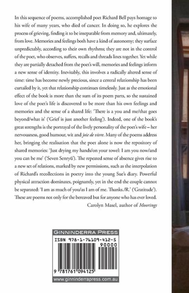 "In this sequence of poems, accomplished poet Richard Bell pays homage to his wife of many years, who died of cancer. In doing so, he explores the process of grieving, finding it to be inseparable from memory and, ultimately, from love. Memories and feelings both have a kind of autonomy; they surface unpredictably, according to their own rhythms; they are not in the control of the poet, who observes, suffers, recalls and threads lines together. Yet while they are partially detached from the poet's will, memories and feelings inform a new sense of identity. Inevitably, this involves a radically altered sense of time: time has become newly precious, since a central relationship has been curtailed by it, yet that relationship continues timelessly. Just as the emotional effect of the book is more than the sum of its poem parts, so the sustained love of the poet's life is discovered to be more than his own feelings and memories and the sense of a shared life: 'There is a you and me/that goes beyond/what is' ('Grief is just another feeling'). Indeed, one of the book's great strengths is the portrayal of the lively personality of the poet's wife - her nervousness, good humour, wit and joie de vivre. Many of the poems address her, bringing the realisation that the poet alone is now the repository of shared memories: 'Just drying my hands/on your towel: I am you now/and you can be me' ('Seven Senry¿'). The repeated sense of absence gives rise to a new set of relations, marked by new permissions, such as the interpolation of Richard's recollections in poetry into the young Sue's diary. Powerful physical attraction dominates, poignantly, yet in the end the couple cannot be separated: 'I am as much of you/as I am of me. Thanks./R.' ('Gratitude'). These are poems not only for the bereaved but for anyone who has ever loved." - Carolyn Masel, author of Moorings