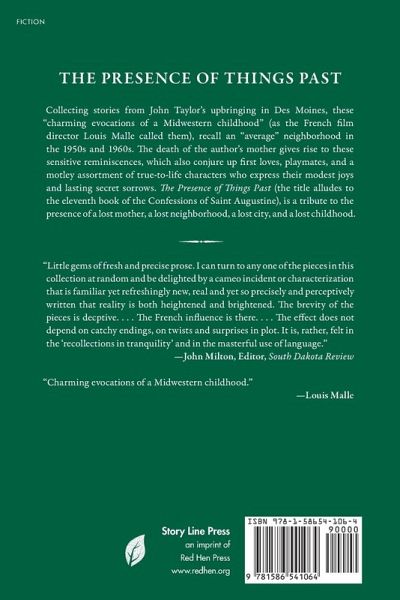Collecting stories from John Taylor’s upbringing in Des Moines, these "charming evocations of a Midwestern childhood" (as the French film director Louis Malle called them), recall an "average" neighborhood in the 1950s and 1960s. The death of the author’s mother gives rise to these sensitive reminiscences, which also conjure up first loves, playmates, and a motley assortment of true-to-life characters who express their modest joys and lasting secret sorrows. The Presence of Things Past (the title alludes to the eleventh book of the Confessions of Saint Augustine), is a tribute to a lost mother, a lost neighborhood, a lost city, and a lost childhood.