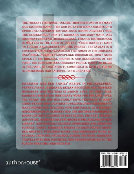 The Present Testament Volume Thirteen is one of my many God-inspired books. This God-dictated book consists of a spiritual conversation/dialogue among Almighty God, the Blessed Holy Trinity, Barbara Ann Mary Mack, and his great creation (human beings). This God-inspired book is written in the form of poetry, which makes it easy to follow and understand. The Present Testament is a continuation of the Old and New Testament of the Christian Holy Bible. Almighty God speaks through me today as he spoke to the biblical prophets and messengers of the past. The Lord God uses ordinary people today as he did in the past. He continues to communicate with us, for he is unchanging and faithful to his creation.