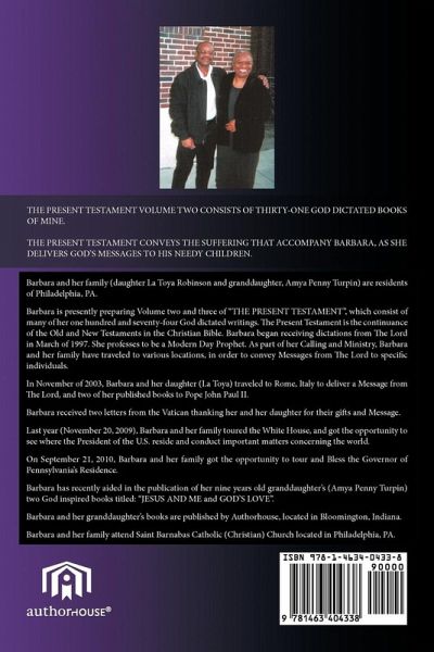 THE PRESENT TESTAMENT VOLUME TWO CONSISTS OF THIRTY-ONE GOD DICTATED BOOKS OF MINE. THE PRESENT TESTAMENT CONVEYS THE SUFFERING THAT ACCOMPANY BARBARA, AS SHE DELIVERS GOD'S MESSAGES TO HIS NEEDY CHILDREN.
