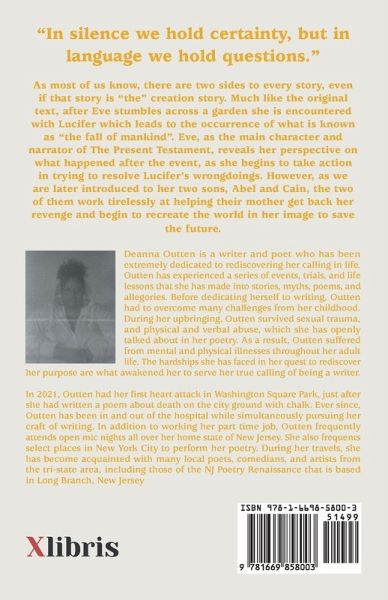 "In silence we hold certainty, but in language we hold questions." As most of us know, there are two sides to every story, even if that story is "the" creation story. Much like the original text, after Eve stumbles across a garden she is encountered with Lucifer which leads to the occurrence of what is known as "the fall of mankind". Eve, as the main character and narrator of The Present Testament, reveals her perspective on what happened after the event, as she begins to take action in trying to resolve Lucifer's wrongdoings. However, as we are later introduced to her two sons, Abel and Cain, the two of them work tirelessly at helping their mother get back her revenge and begin to recreate the world in her image to save the future.