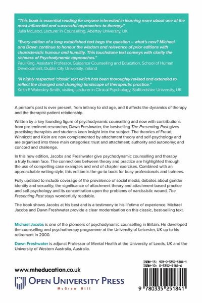 "This book is essential reading for anyone interested in learning more about one of the most influential and successful approaches to therapy." Julia McLeod, Lecturer in Counselling, Abertay University, UK "Every edition of a long established text begs the question - what's new? Michael and Dawn continue to honour the wisdom and relevance of prior editions with characteristic humour and humility. This touchstone text conveys with clarity the richness of Psychodynamic approaches." Paul King, Assistant Professor, Guidance Counselling and Education, School of Human Development, Dublin City University, Ireland "A highly respected 'classic' text which has been thoroughly revised and extended to reflect the changed and changing landscape of therapeutic practice." Keith E Walmsley-Smith, visiting Lecturer in Clinical Psychology, Staffordshire University, UK A person's past is ever present, from infancy to old age, and it affects the dynamics of therapy and the therapist-patient relationship. Written by a key founding figure of psychodynamic counselling and now with contributions from pre-eminent researcher, Dawn Freshwater, the bestselling The Presenting Past gives practicing therapists and students keen insight into the subject. The theories of Freud, Winnicott, Klein are now complimented by attachment theory and self-psychology and are organized into three main categories: trust and attachment; authority and autonomy; and concord and challenge. In this new edition, Jacobs and Freshwater give psychodynamic counselling and therapy a truly human face. The connections between theory and practice are highlighted through the use of compelling case examples and end of chapter exercises. Combined with an approachable writing style, this edition is the go-to for busy professionals and trainees. Fully updated to include coverage of the prevalence of social media; debates about gender identity and sexuality; the significance of attachment theory and attachment-based practice and self-psychology and its concentration upon the problems of narcissistic wound, The Presenting Past stays wonderfully readable. The book shows Jacobs at his best and is a testimony to his lifetime of experience. Michael Jacobs and Dawn Freshwater provide a clear modernisation on this classic, best-selling text. Michael Jacobs is one of the pioneers of psychodynamic counselling in Britain. He developed the counselling and psychotherapy programme at the University of Leicester, UK up to his retirement in 2000. Dawn Freshwater is adjunct Professor of Mental Health at the University of Leeds, UK and the University of Western Australia, Australia.