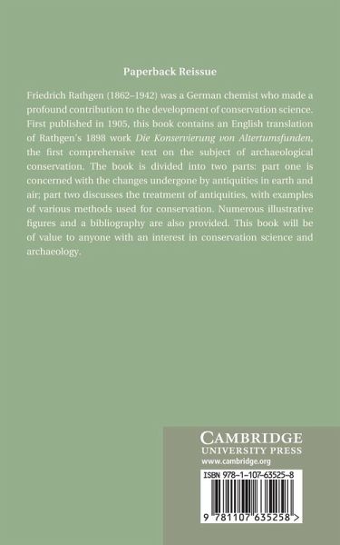 Friedrich Rathgen (1862-1942) was a German chemist who made a profound contribution to the development of conservation science. First published in 1905, this book contains an English translation of Rathgen's 1898 work Die Konservierung von Altertumsfunden, the first comprehensive text on the subject of archaeological conservation. The book is divided into two parts: part one is concerned with the changes undergone by antiquities in earth and air; part two discusses the treatment of antiquities, with examples of various methods used for conservation. Numerous illustrative figures and a bibliography are also provided. This book will be of value to anyone with an interest in conservation science and archaeology.