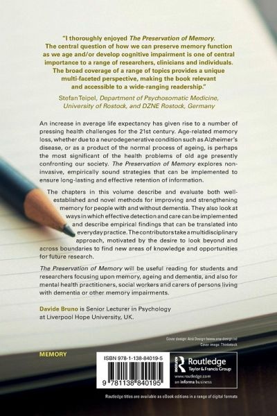 The Preservation of Memory explores non-invasive, empirically-sound strategies which ensure long-lasting and effective retention of information for individuals which are coping with the effects of age-related memory loss. It will be essential reading for students and researchers focusing upon memory, aging and dementia, and also clinical practitioners working in this area.