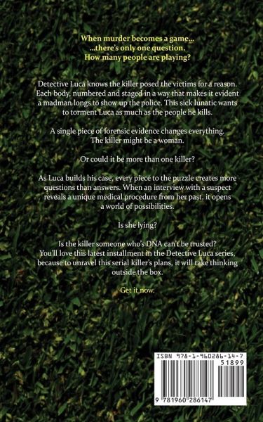 When murder becomes a game... ...there's only one question. How many people are playing? Detective Luca knows the killer posed the victims for a reason. Each body, numbered and staged in a way that makes it evident a madman longs to show up the police. This sick lunatic wants to torment Luca as much as the people he kills. A single piece of forensic evidence changes everything. The killer might be a woman. Or could it be more than one killer? As Luca builds his case, every piece to the puzzle creates more questions than answers. When an interview with a suspect reveals a unique medical procedure from her past, it opens a world of possibilities. Is she lying? Is the killer someone who's DNA can't be trusted? You'll love this latest installment in the Detective Luca series, because to unravel this serial killer's plans, it will take thinking outside the box. *You can enter the Luca Mystery Series with any book. Start now.