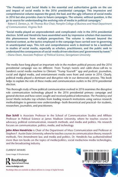 Dan Schill is Associate Professor in the School of Communication Studies and Affiliate Professor in Political Science at James Madison University, where he teaches courses in advocacy, political communication, research methods, and media and politics. His research focuses on communication, politics, media, and technology. John Allen Hendricks is Chair of the Department of Mass Communication and Professor at Stephen F. Austin State University, where he teaches courses in communication theory, research methods, First Amendment law, and media and politics. Dr. Hendricks has authored/edited more than ten books on the topics of media/politics, social media/new media technologies, and the broadcasting industry.